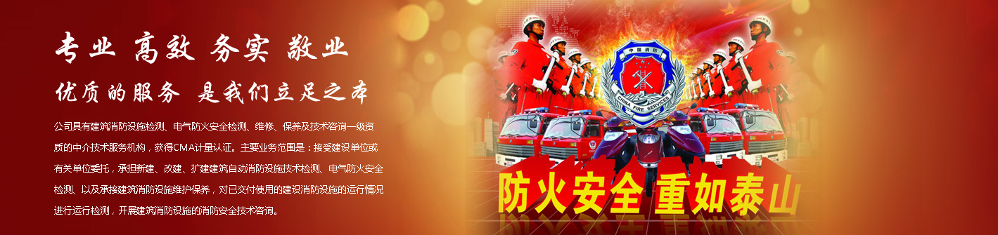 公司具有建筑消防設(shè)施檢測(cè)、電氣防火安全檢測(cè)、維修、保養(yǎng)及技術(shù)咨詢一級(jí)資質(zhì)的中介技術(shù)服務(wù)機(jī)構(gòu),獲得CMA計(jì)量認(rèn)證。主要業(yè)務(wù)范圍是:接受建設(shè)單位或有關(guān)單位委托,承擔(dān)新建、改建、擴(kuò)建建筑自動(dòng)消防設(shè)施技術(shù)檢測(cè)、電氣防火安全檢測(cè)、以及承接建筑消防設(shè)施維護(hù)保養(yǎng),對(duì)已交付使用的建設(shè)消防設(shè)施的運(yùn)行情況進(jìn)行運(yùn)行檢測(cè),開展建筑消防設(shè)施的消防安全技術(shù)咨詢。公司設(shè)辦公室、總工辦、財(cái)務(wù)部、檢測(cè)部、維保部等職能機(jī)構(gòu),擁有一